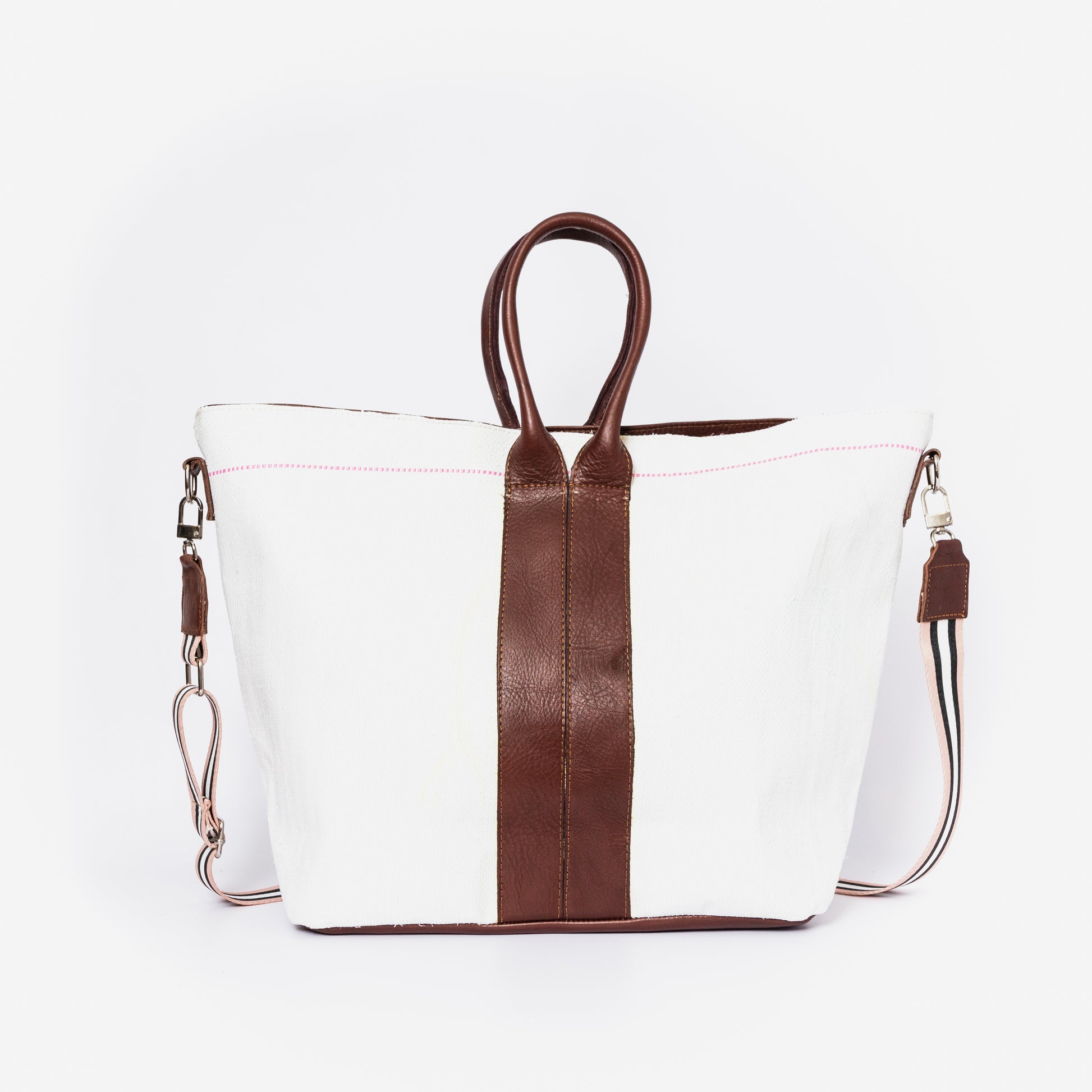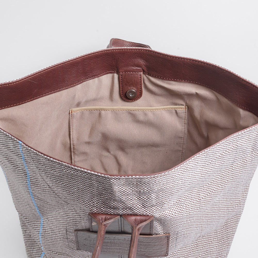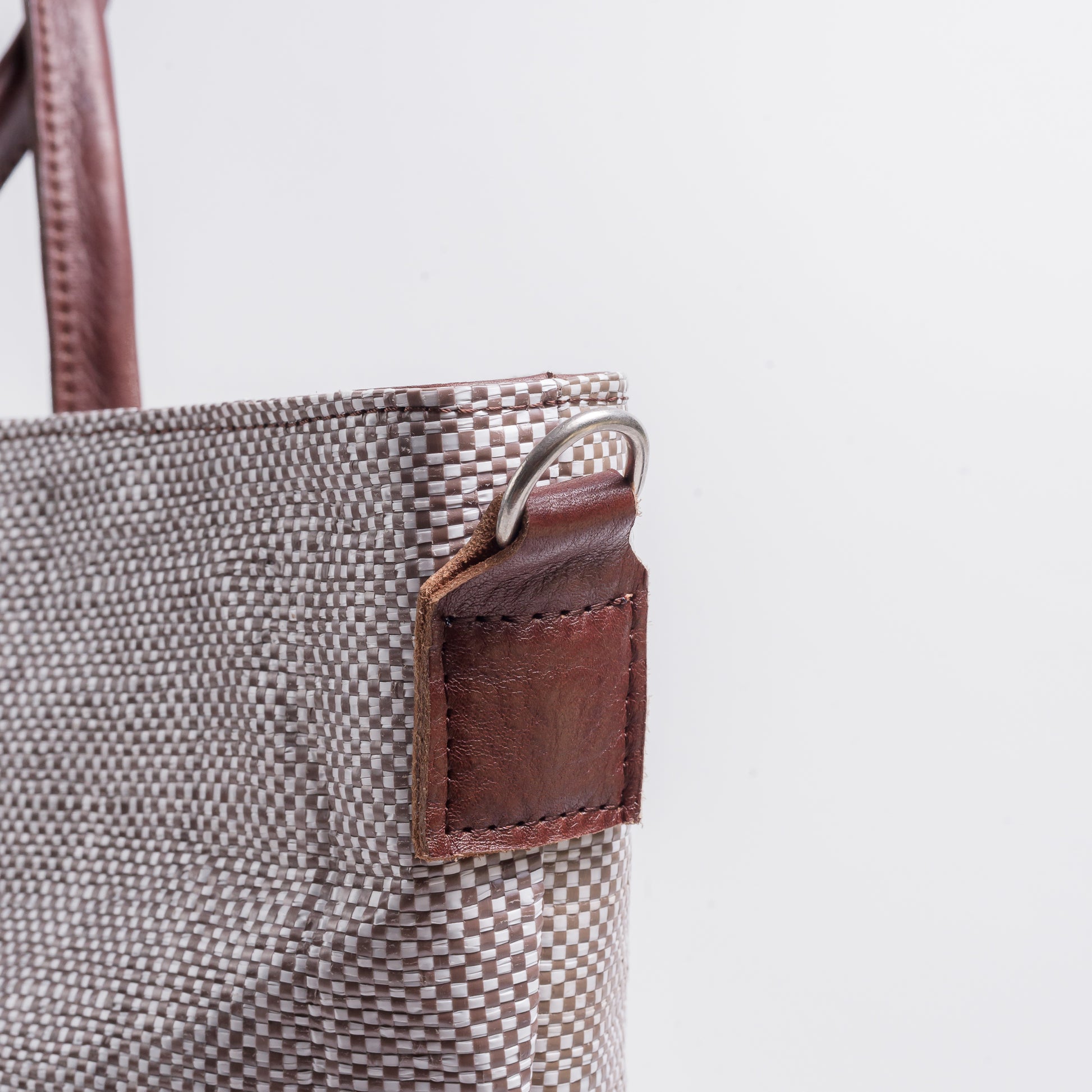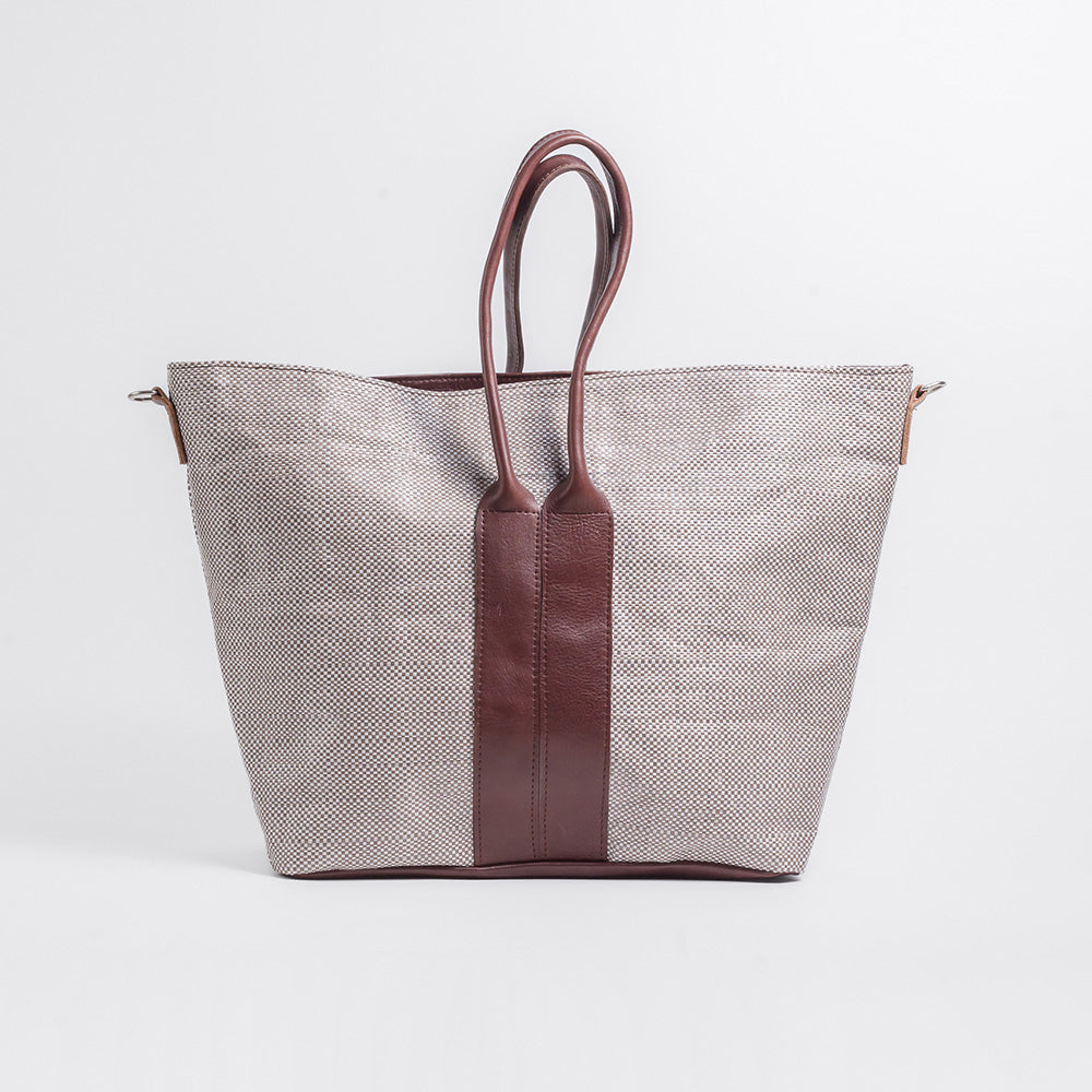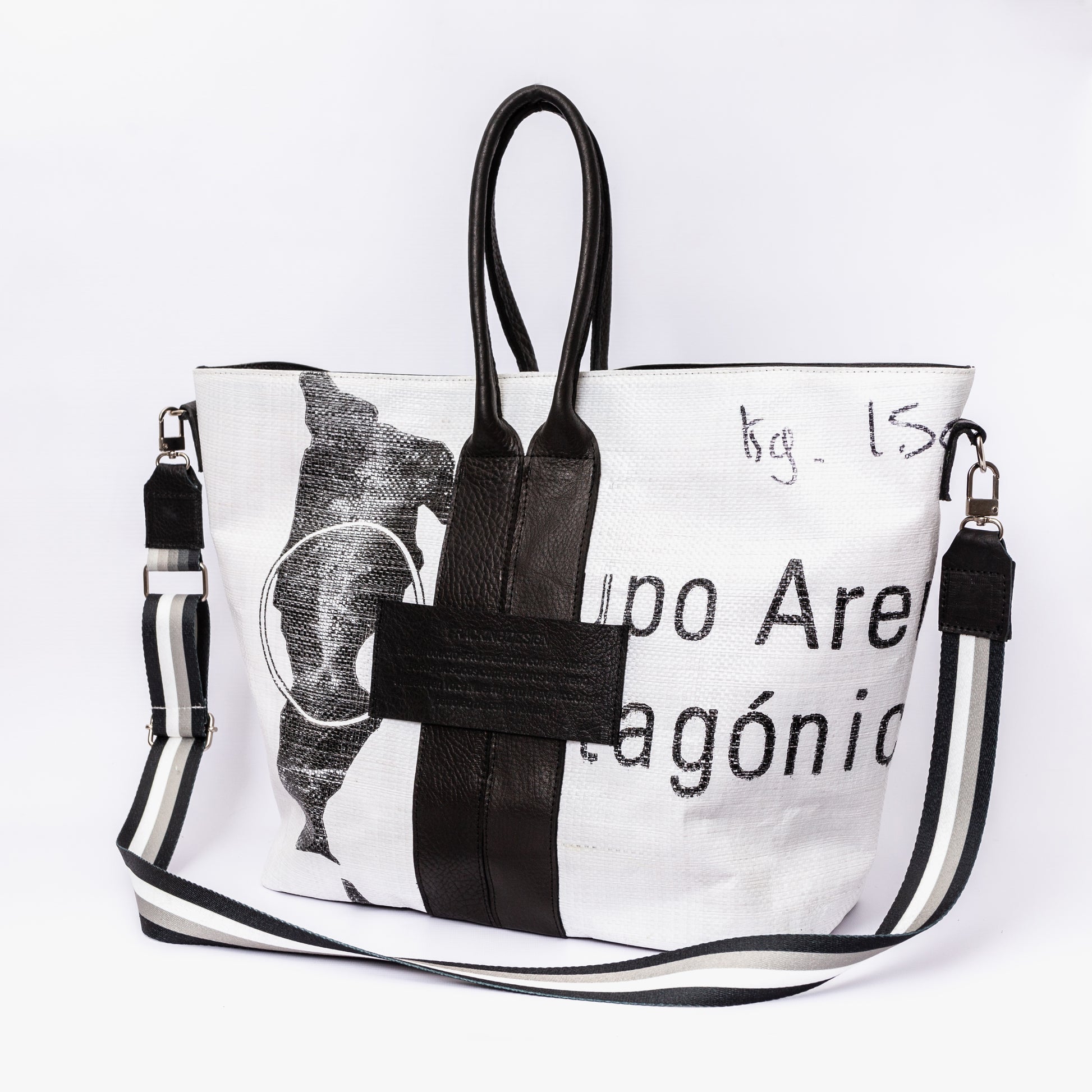 - Description: Tote bag crafted from recycled plastic big bags sourced from Vaca Muerta, Patagonia, Argentina, combined with discarded cowhide leather.