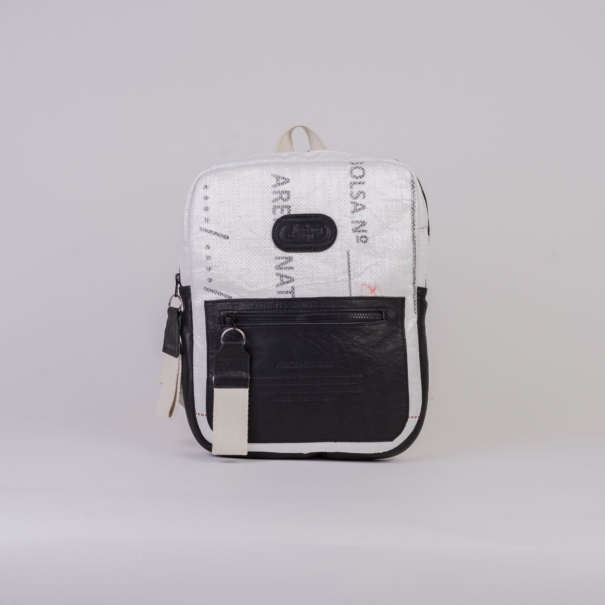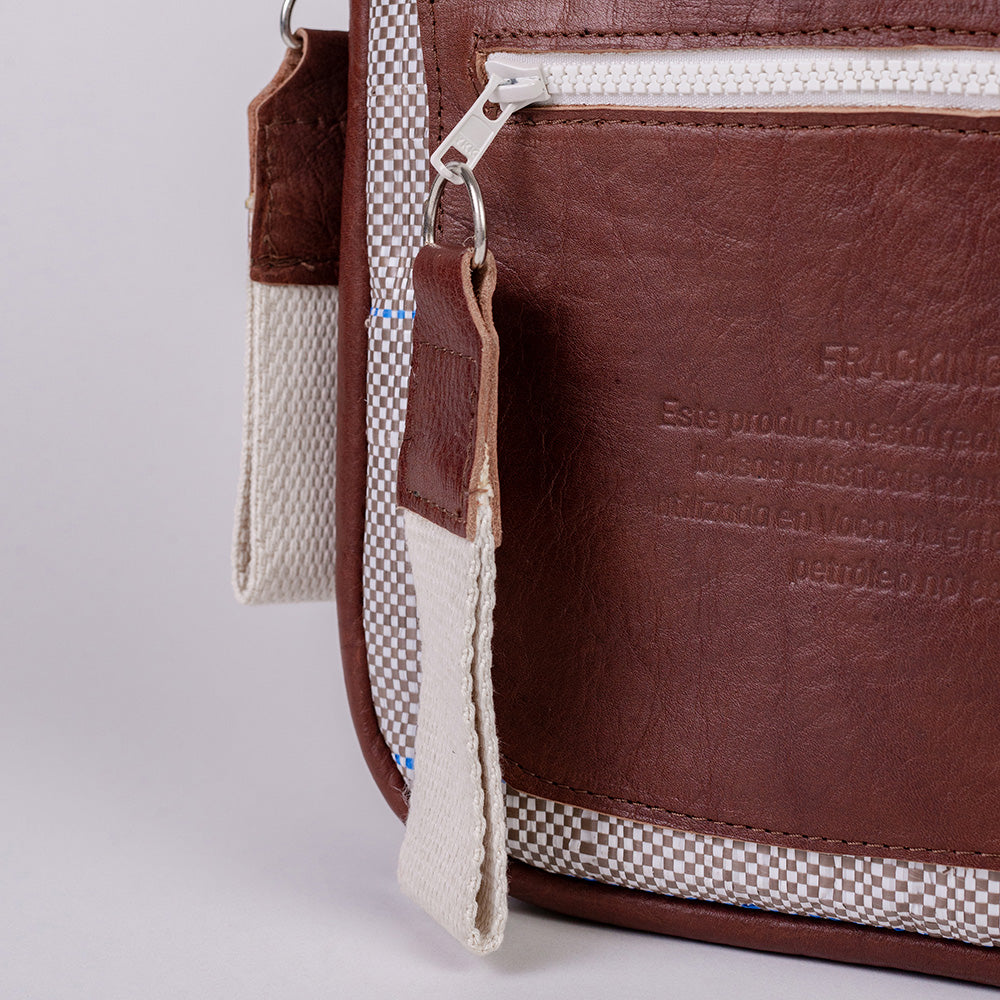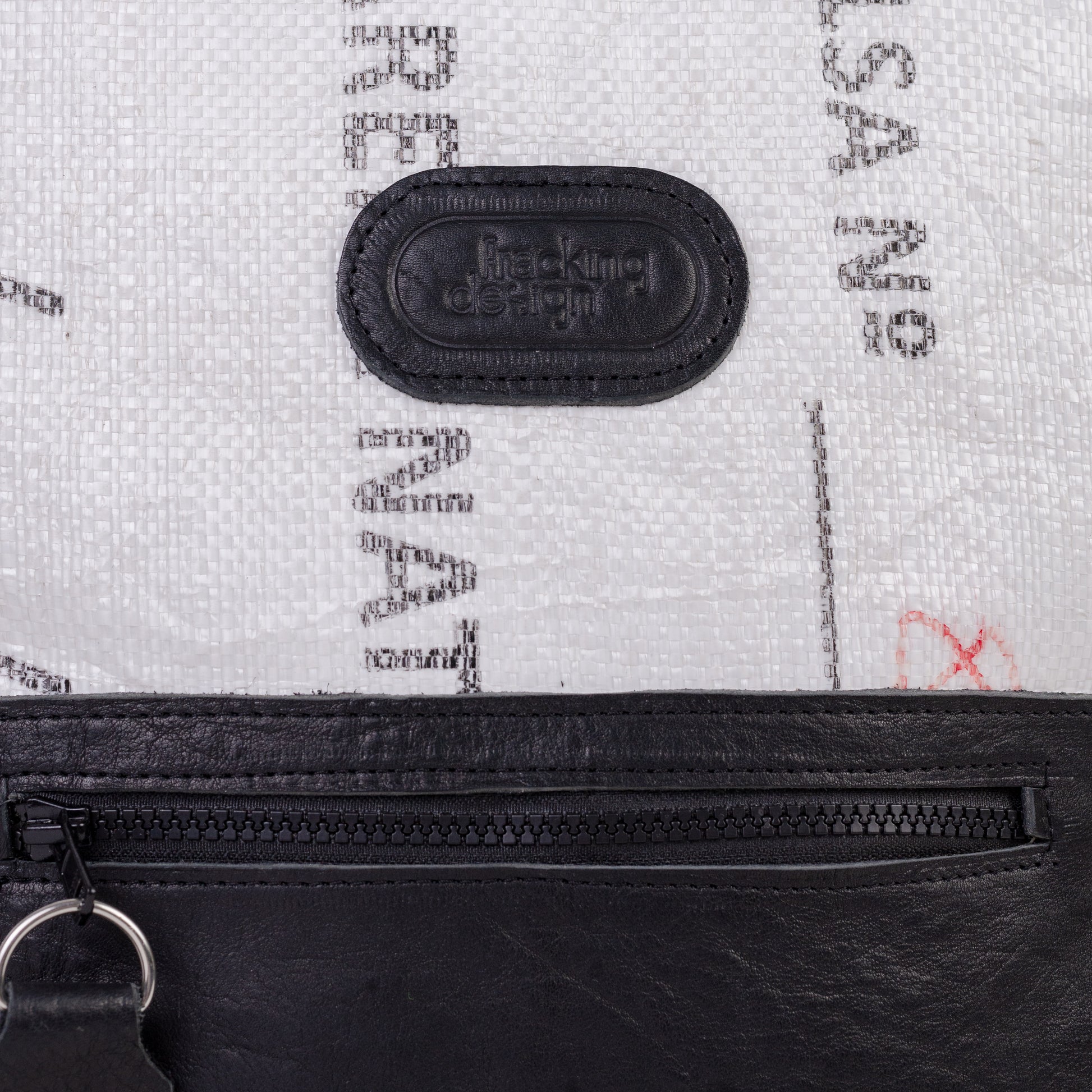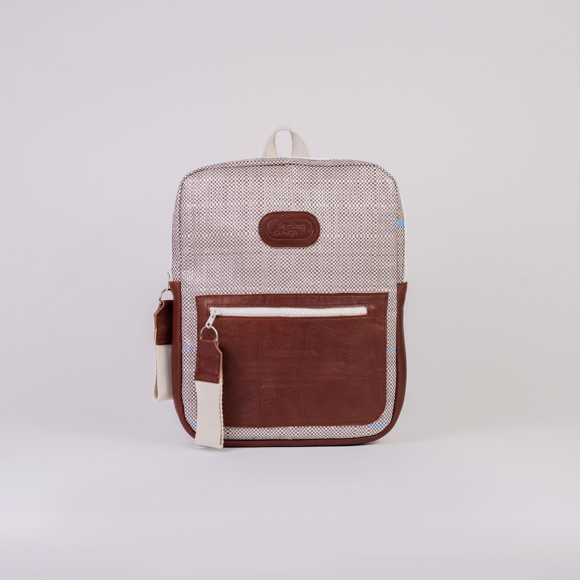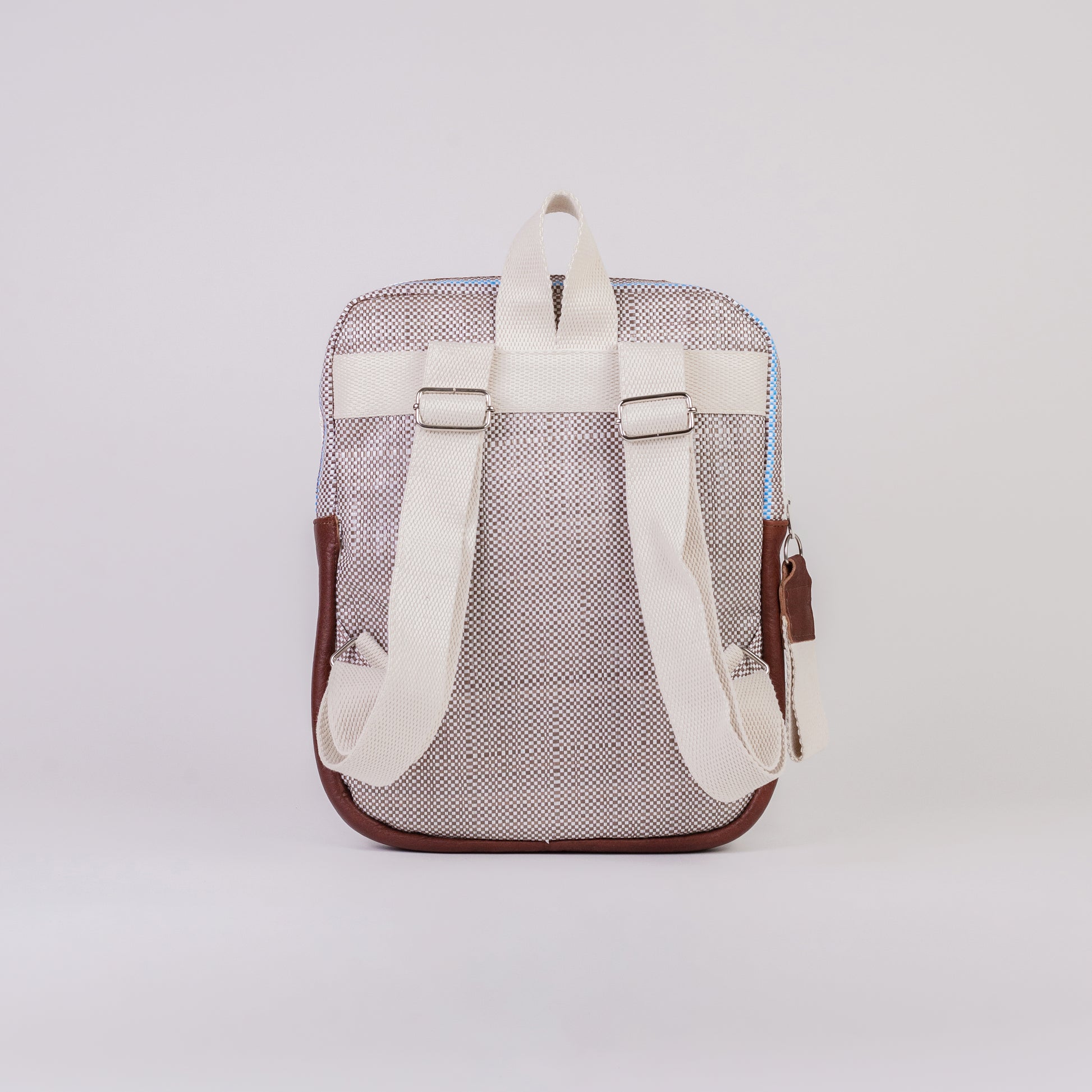 - Description: Backpack made with recycled plastic big bags from Vaca Muerta, Patagonia, Argentina, combined with cowhide leather from discards.